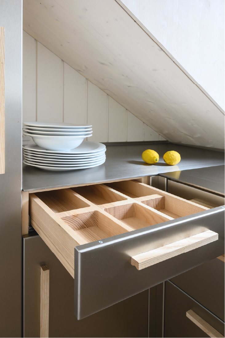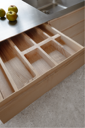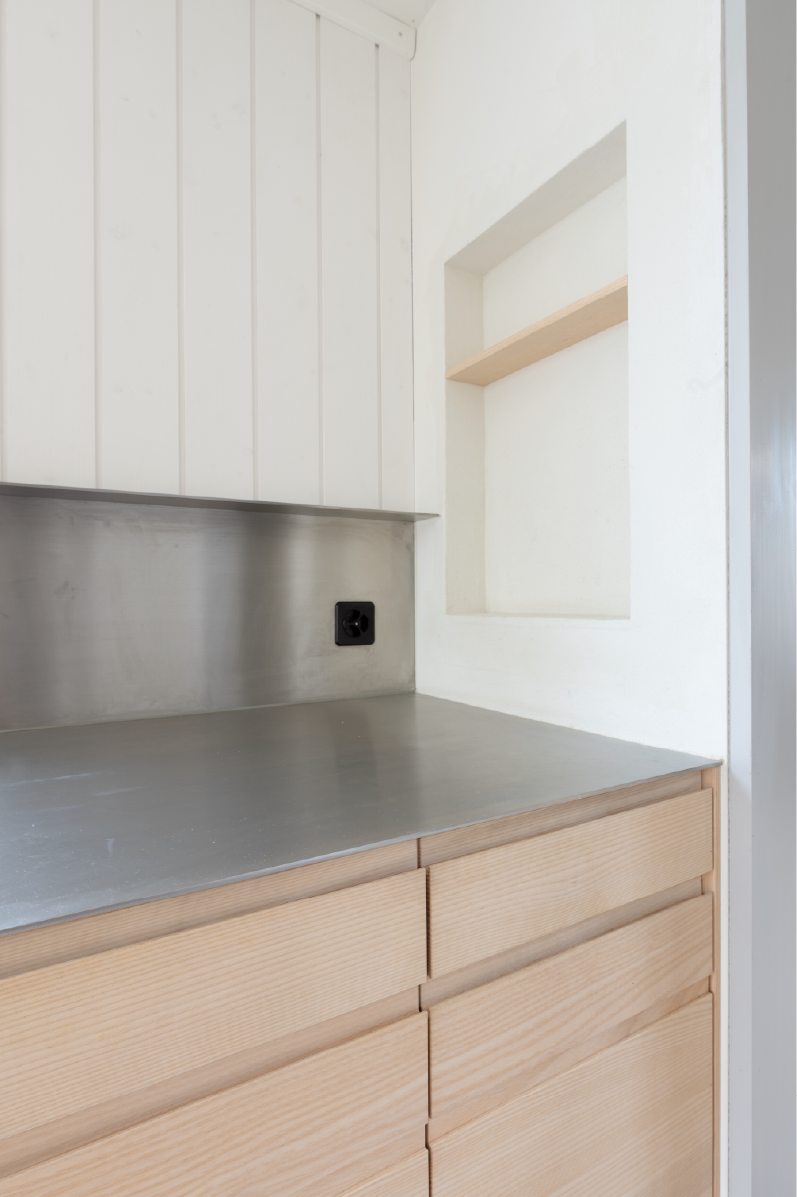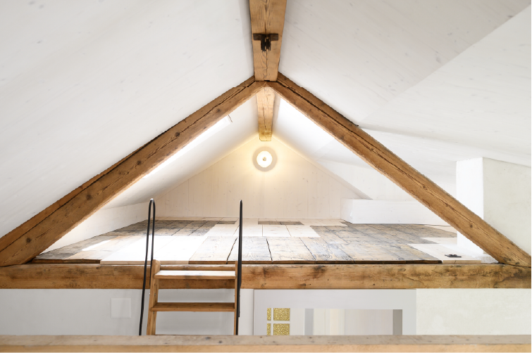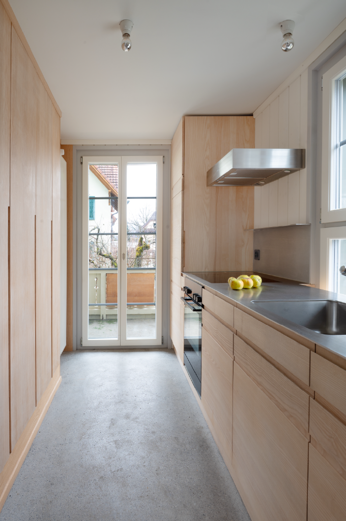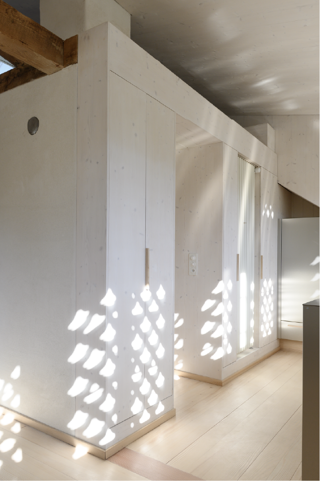 Bei dem Umbau des Dreifamilienhauses aus dem Jahr 1924 wurde ein besonderes Augenmerk auf ökonomische und ökologische Nachhaltigkeit gelegt. Ziel des Projekts war es, den Charme des alten Gebäudes zu bewahren und gleichzeitig moderne Wohnstandards zu integrieren. Ein zentrales Element des Umbaus war die Entscheidung, mechanische, leimfreie Verbindungen zu verwenden. Diese Bauweise fördert nicht nur die Langlebigkeit der Konstruktion durch einfach Reperatur, sondern minimiert auch den Einsatz von chemischen Stoffen, die die Raumluftqualität beeinträchtigen könnten. Gleichzeitig überzeugz diese Bauform durch ihre Wirtschaftlichkeit und es entsteht ein Kostenvorteil über den gesamten Lebenszyklus. Durch den Einsatz von Massivholz konnten wir zudem regionale Ressourcen nutzen, die sowohl ökologisch als auch ökonomisch sinnvoll sind. Zusätzlich wurde Lehm als Baustoff gewählt, um eine gesunde und angenehme Wohnatmosphäre zu schaffen. Lehm reguliert die Luftfeuchtigkeit und sorgt für ein angenehmes Raumklima, während er gleichzeitig eine hervorragende Wärmespeicherung bietet.